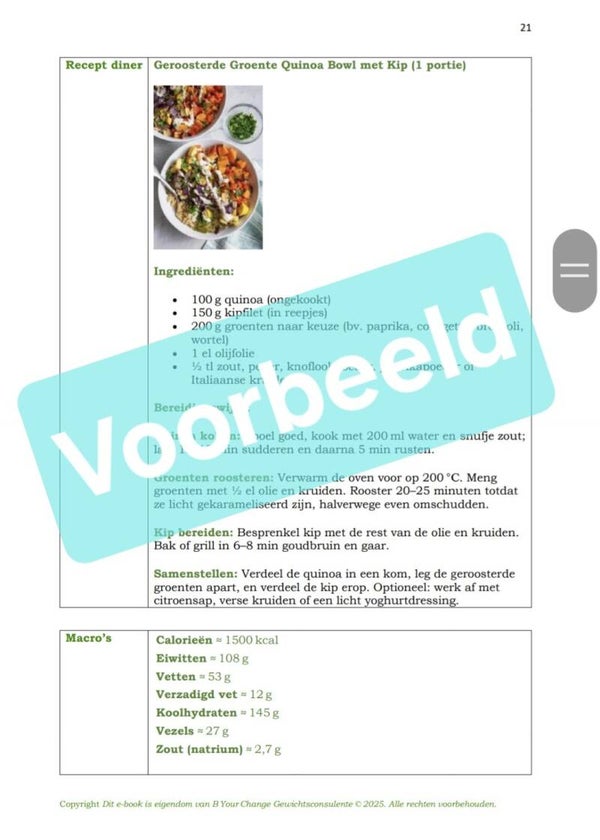 ✅ Complete dagmenu’s – 8 weken lang, duidelijk en praktisch met 1500 kcal per dag, elke dag de macro's erbij!